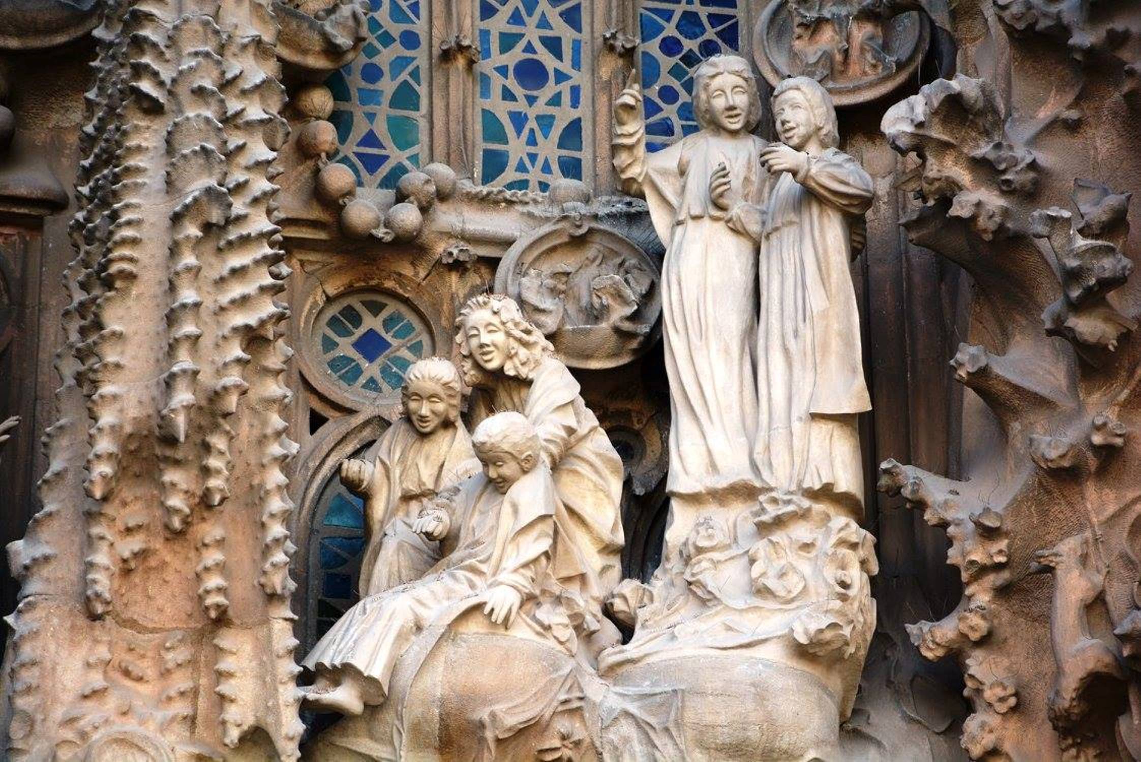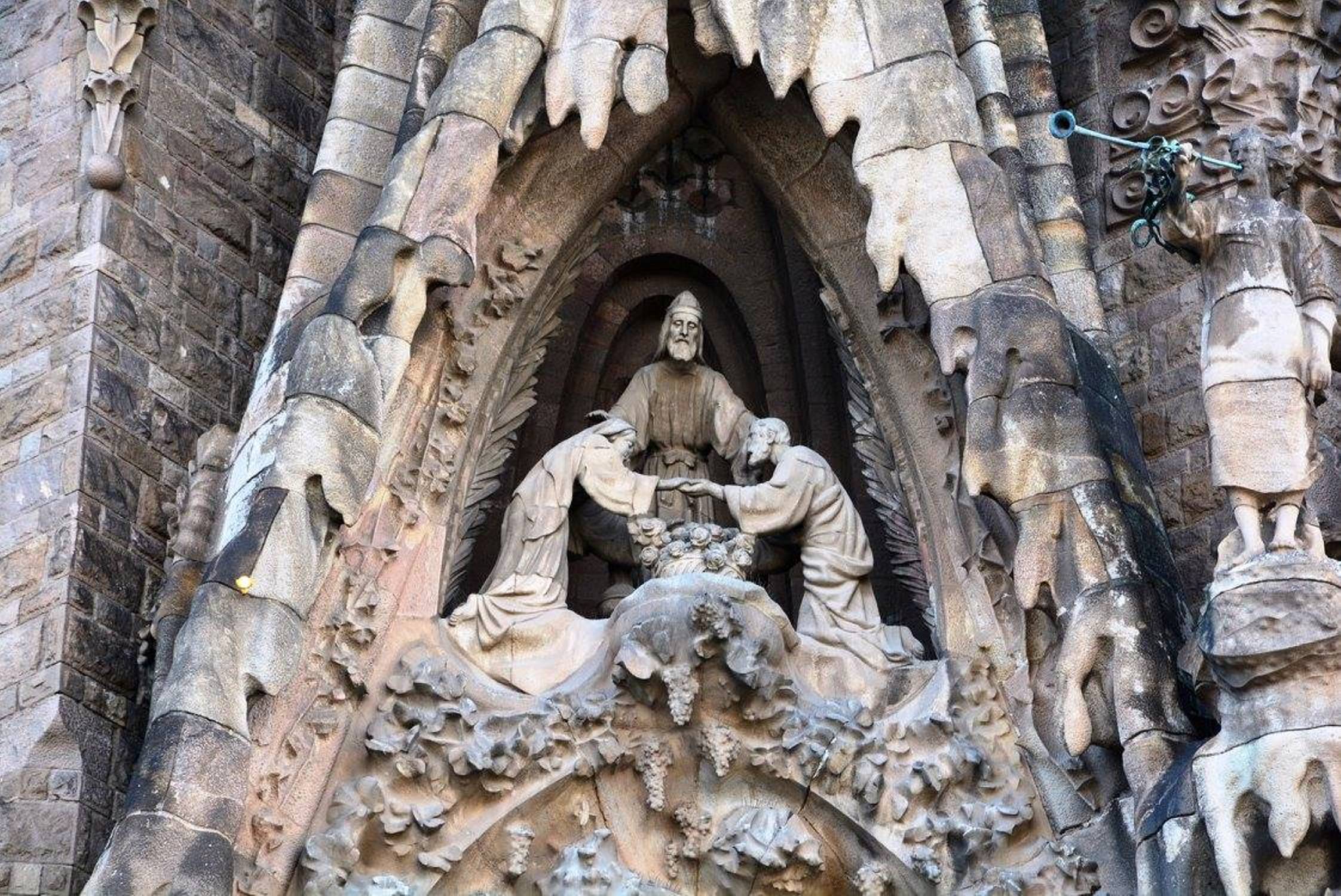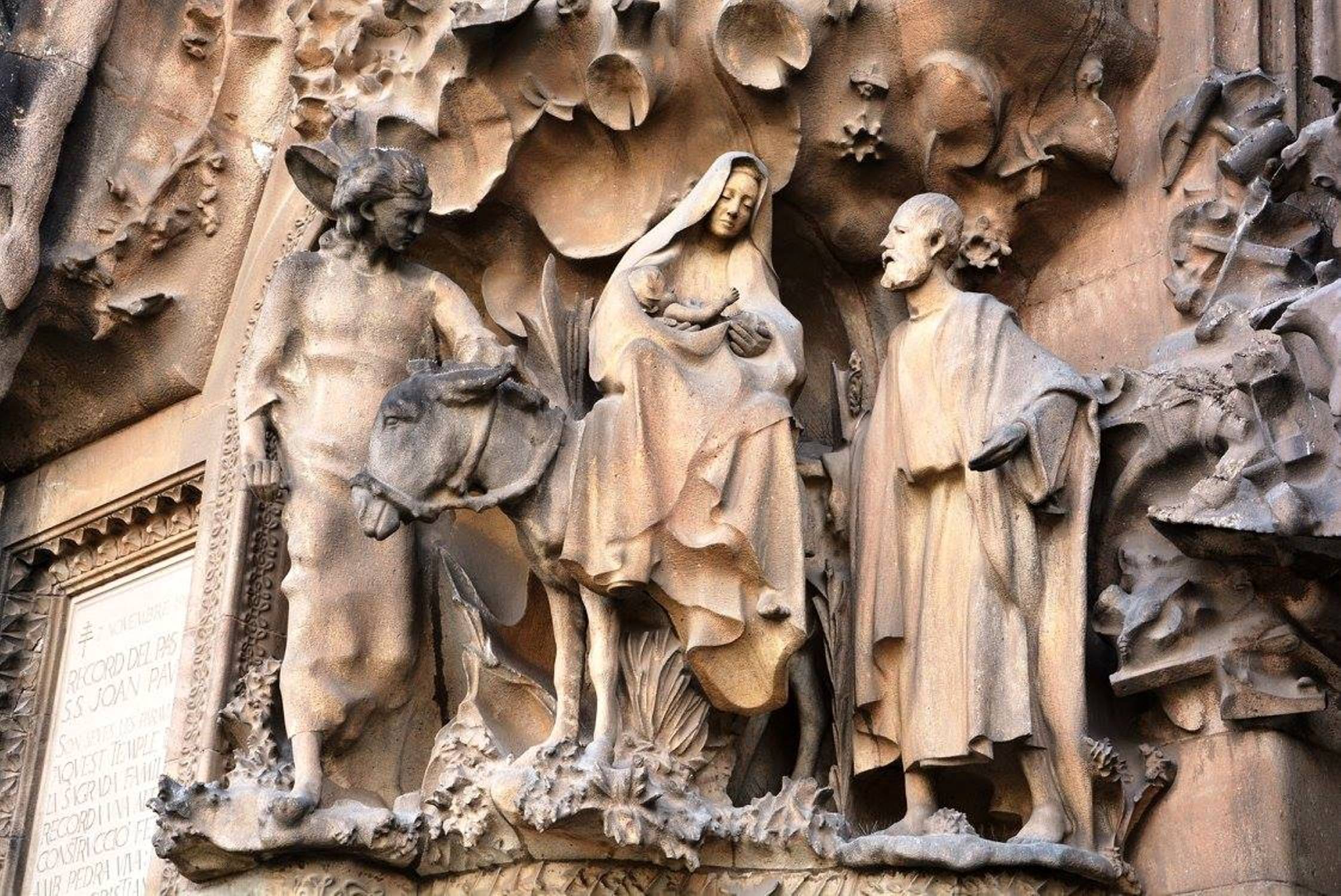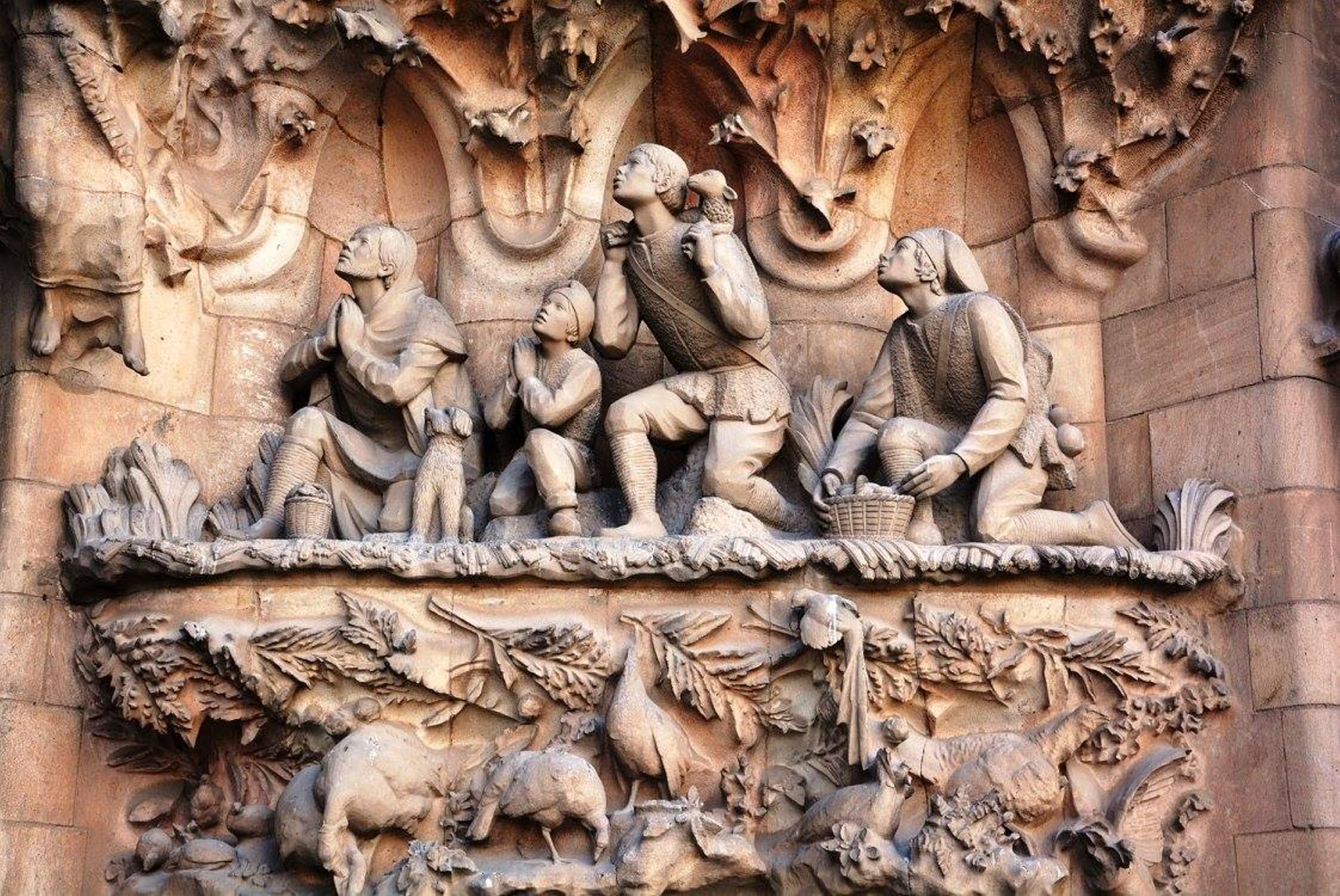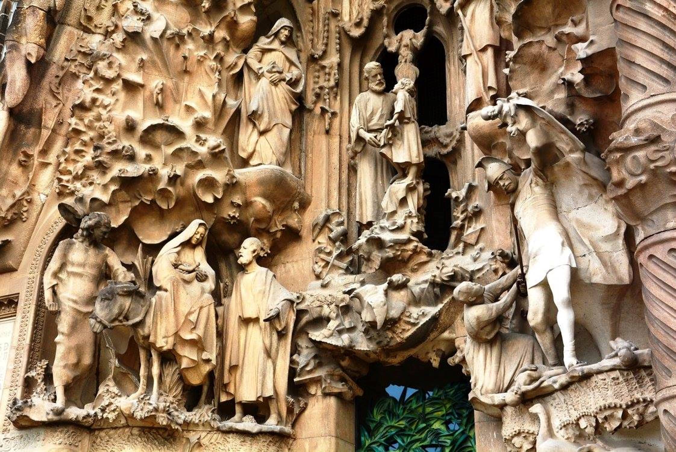 არანაკლებ შთამბეჭდავია საგრადა ფამილია გარედან: ორივე კარს ახალი აღთქმის თემაზე შექნილი ქვის ნაკეთობები ამშვენებს: ხარება, მოგვთა თაყვანისცემა, მირქმა, ეგვიპტეში გამგზავრება, საიდუმლო სერობა, ჯვარცმა, კვართის გაყოფა და ასე შემდეგ.
