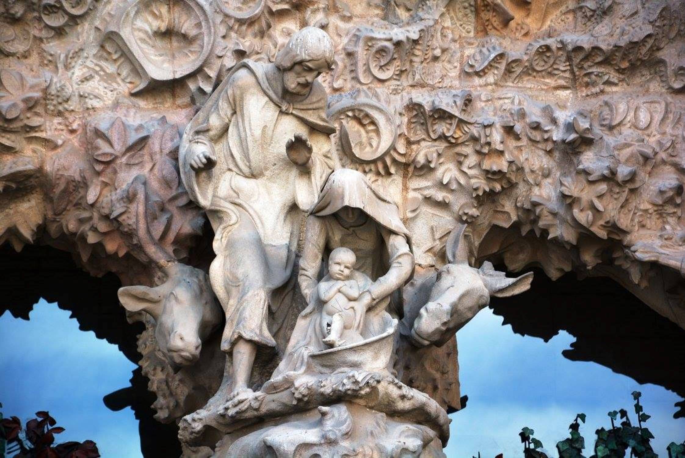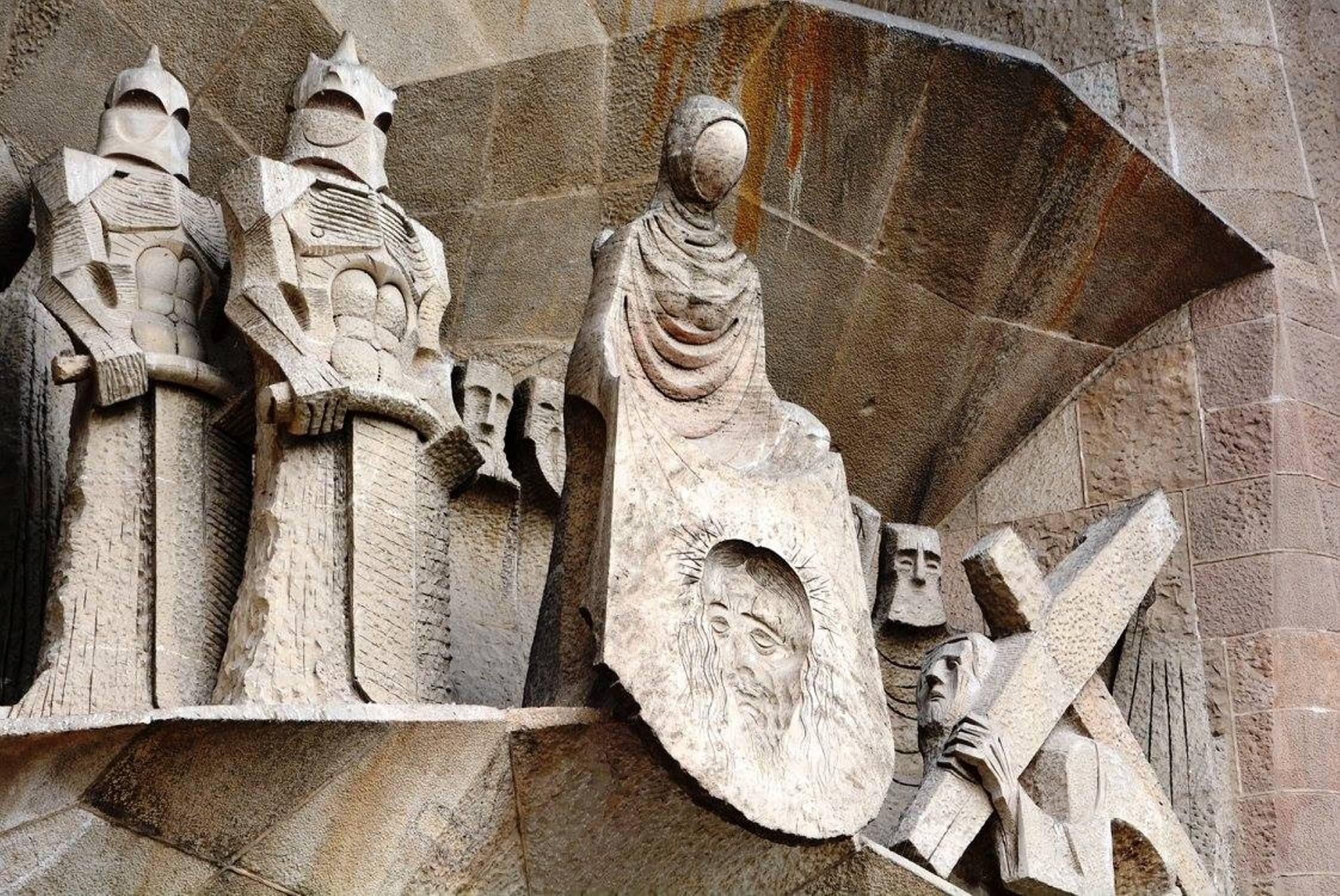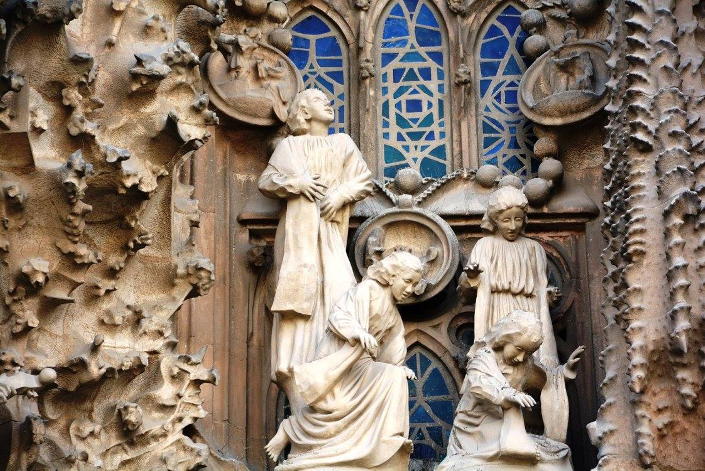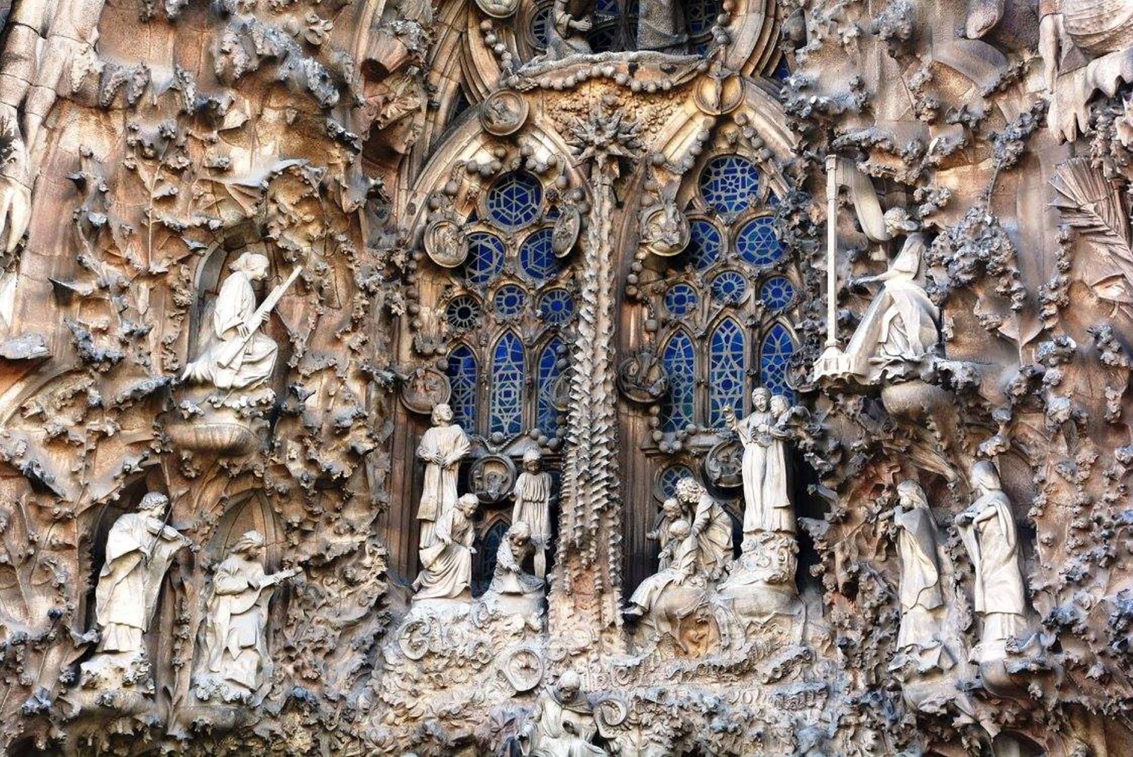 არანაკლებ შთამბეჭდავია საგრადა ფამილია გარედან: ორივე კარს ახალი აღთქმის თემაზე შექნილი ქვის ნაკეთობები ამშვენებს: ხარება, მოგვთა თაყვანისცემა, მირქმა, ეგვიპტეში გამგზავრება, საიდუმლო სერობა, ჯვარცმა, კვართის გაყოფა და ასე შემდეგ.