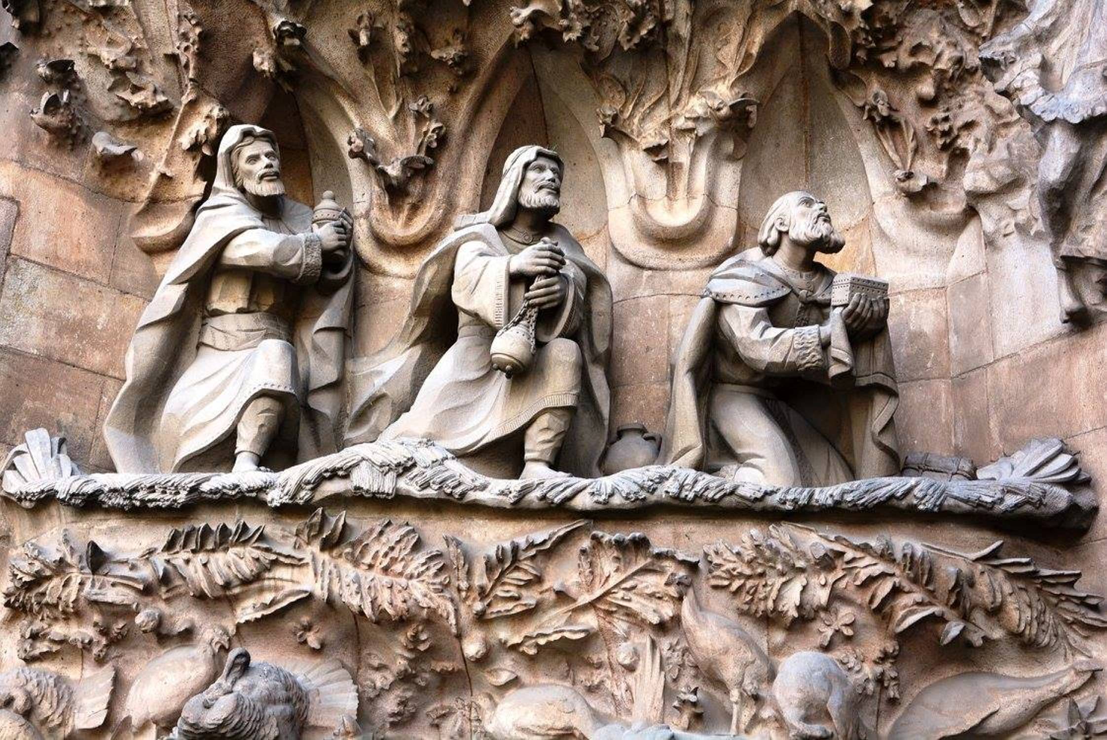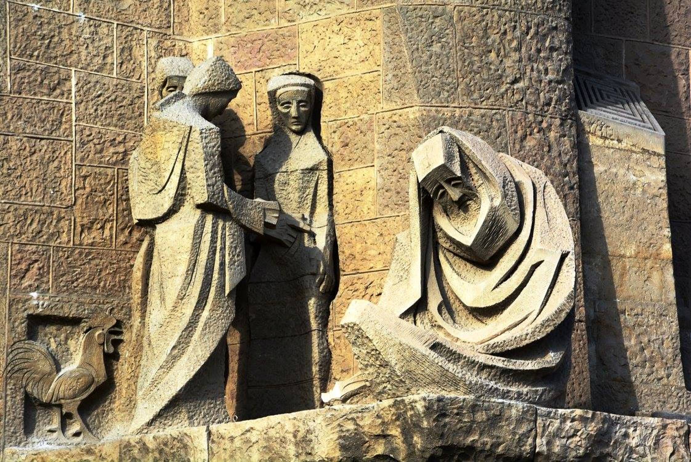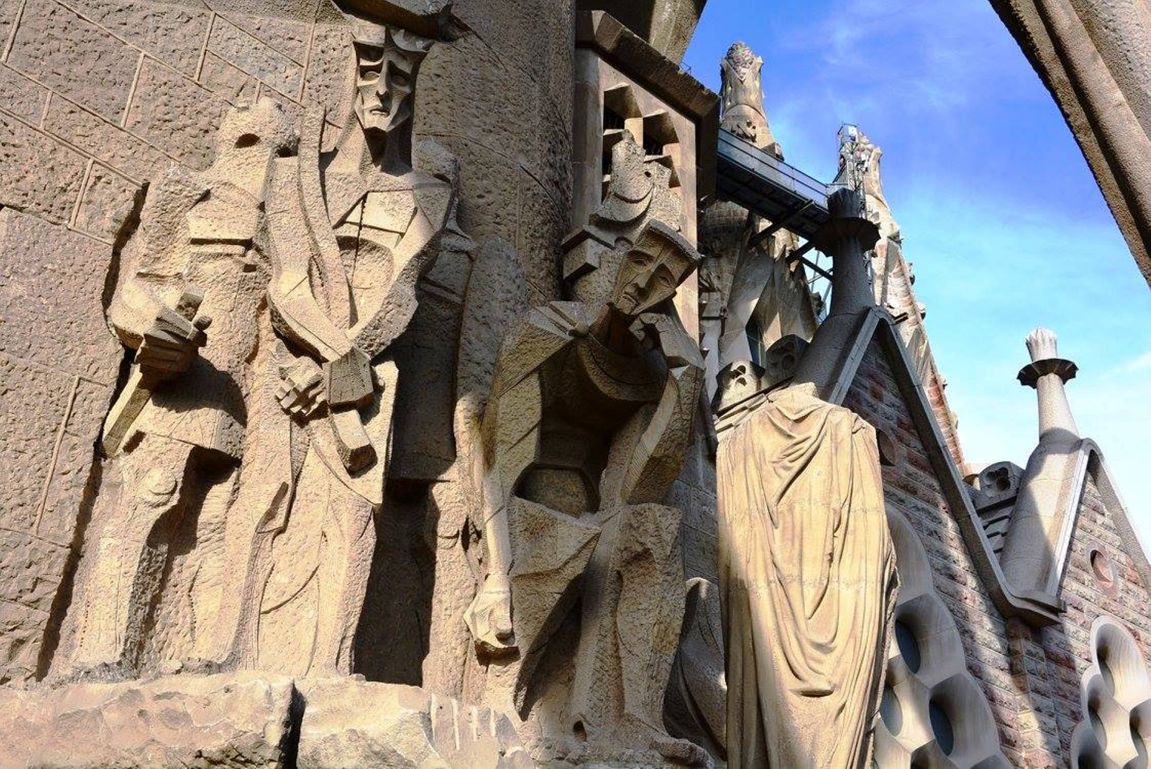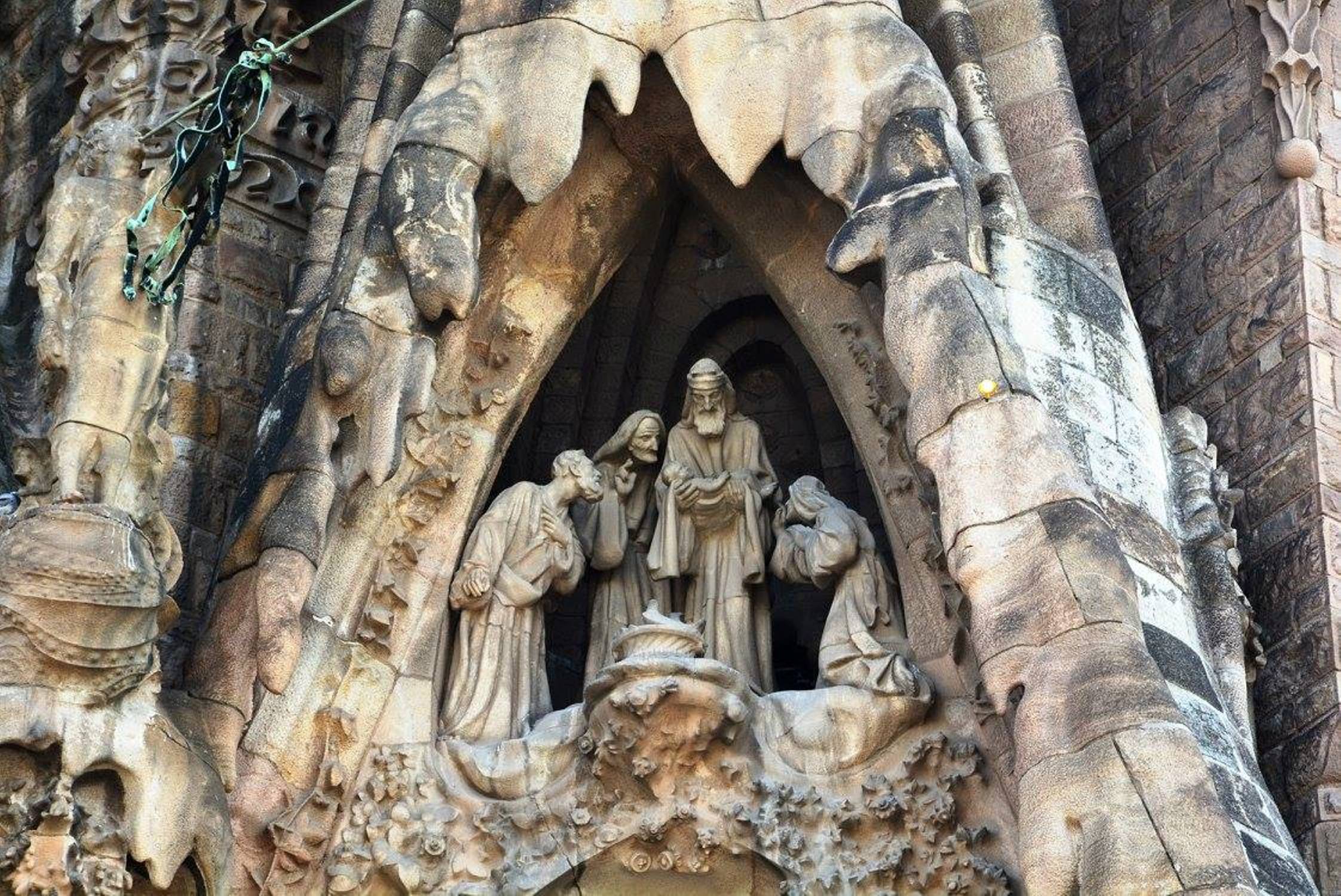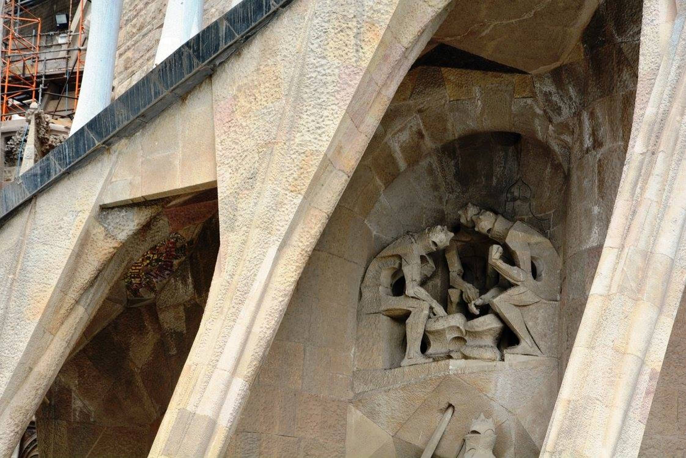 არანაკლებ შთამბეჭდავია საგრადა ფამილია გარედან: ორივე კარს ახალი აღთქმის თემაზე შექნილი ქვის ნაკეთობები ამშვენებს: ხარება, მოგვთა თაყვანისცემა, მირქმა, ეგვიპტეში გამგზავრება, საიდუმლო სერობა, ჯვარცმა, კვართის გაყოფა და ასე შემდეგ.